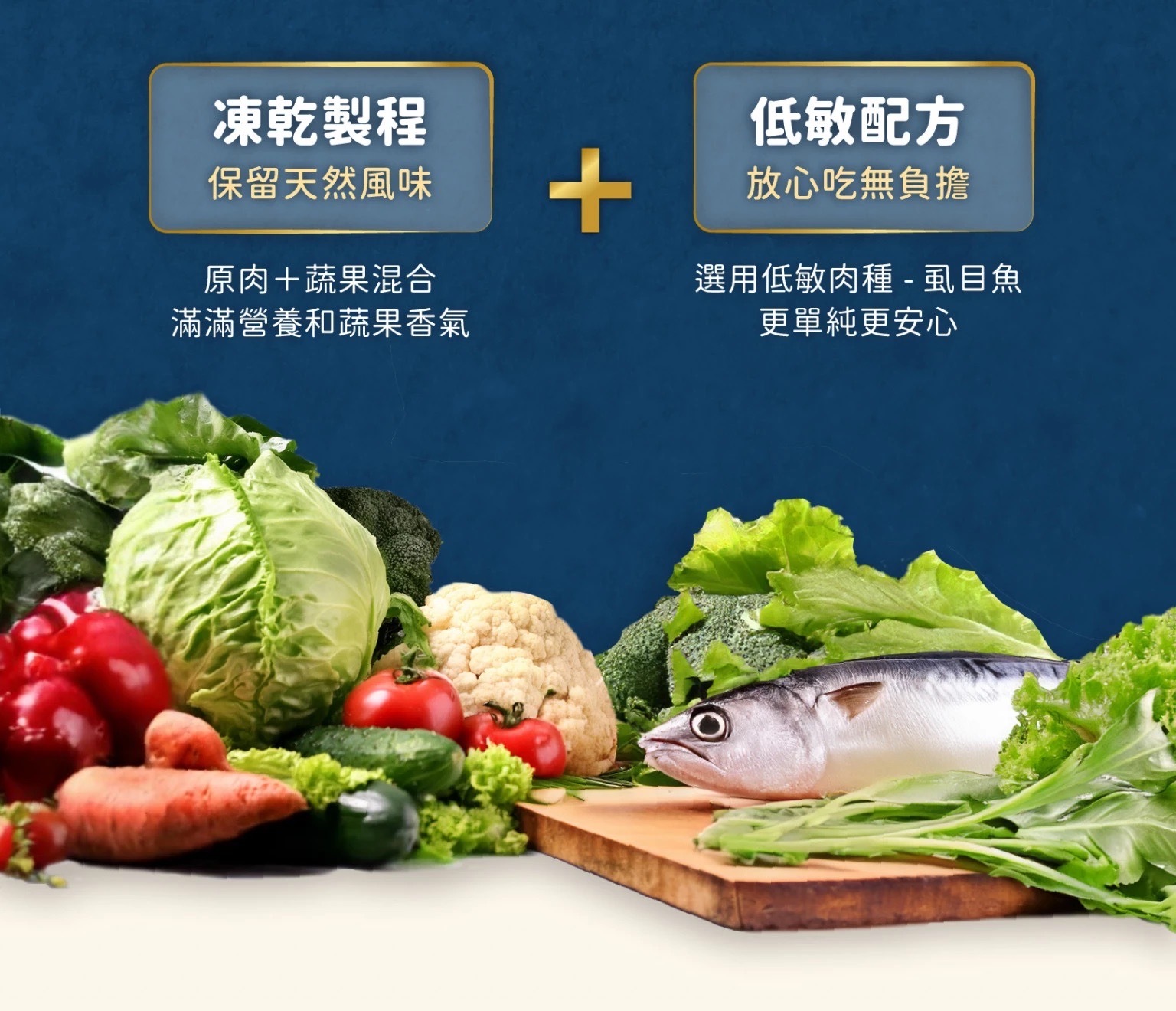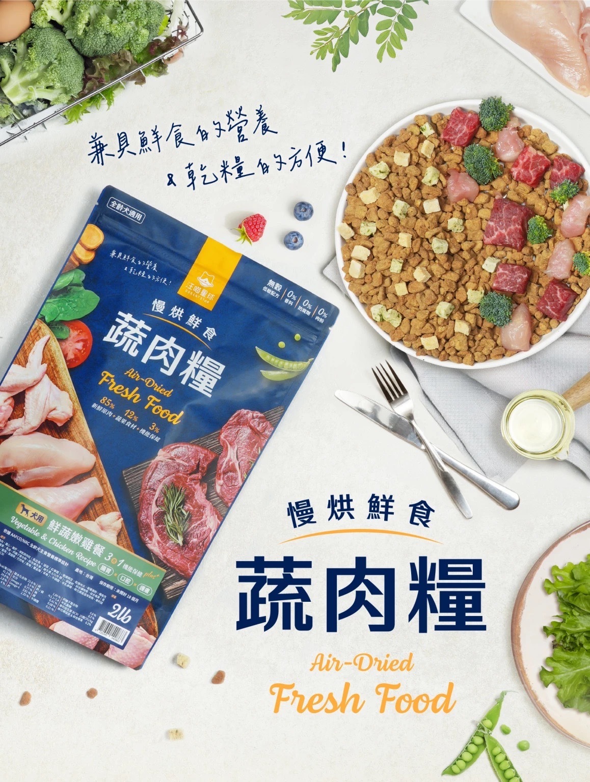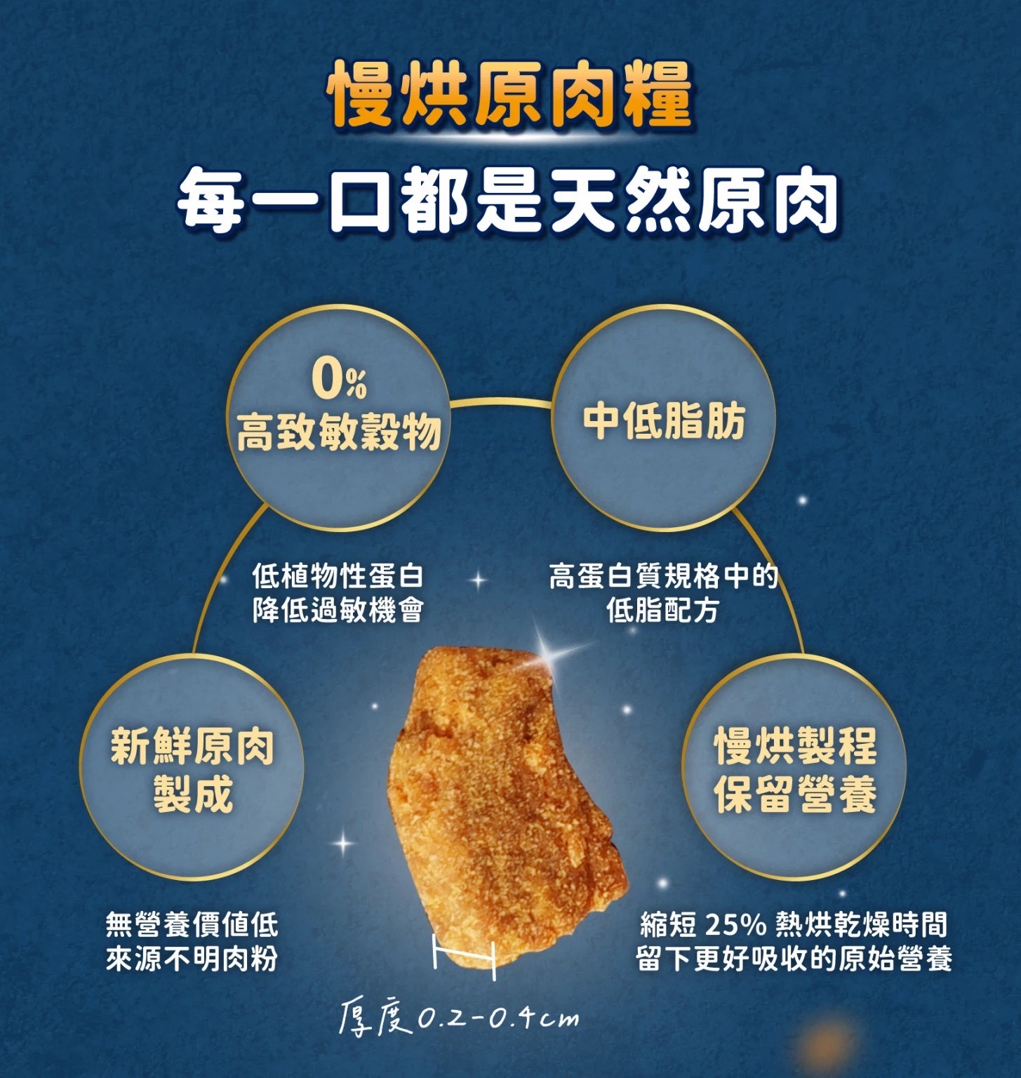 • 慢烘原肉糧+凍乾蔬肉粒,肉菜機能一次滿足!