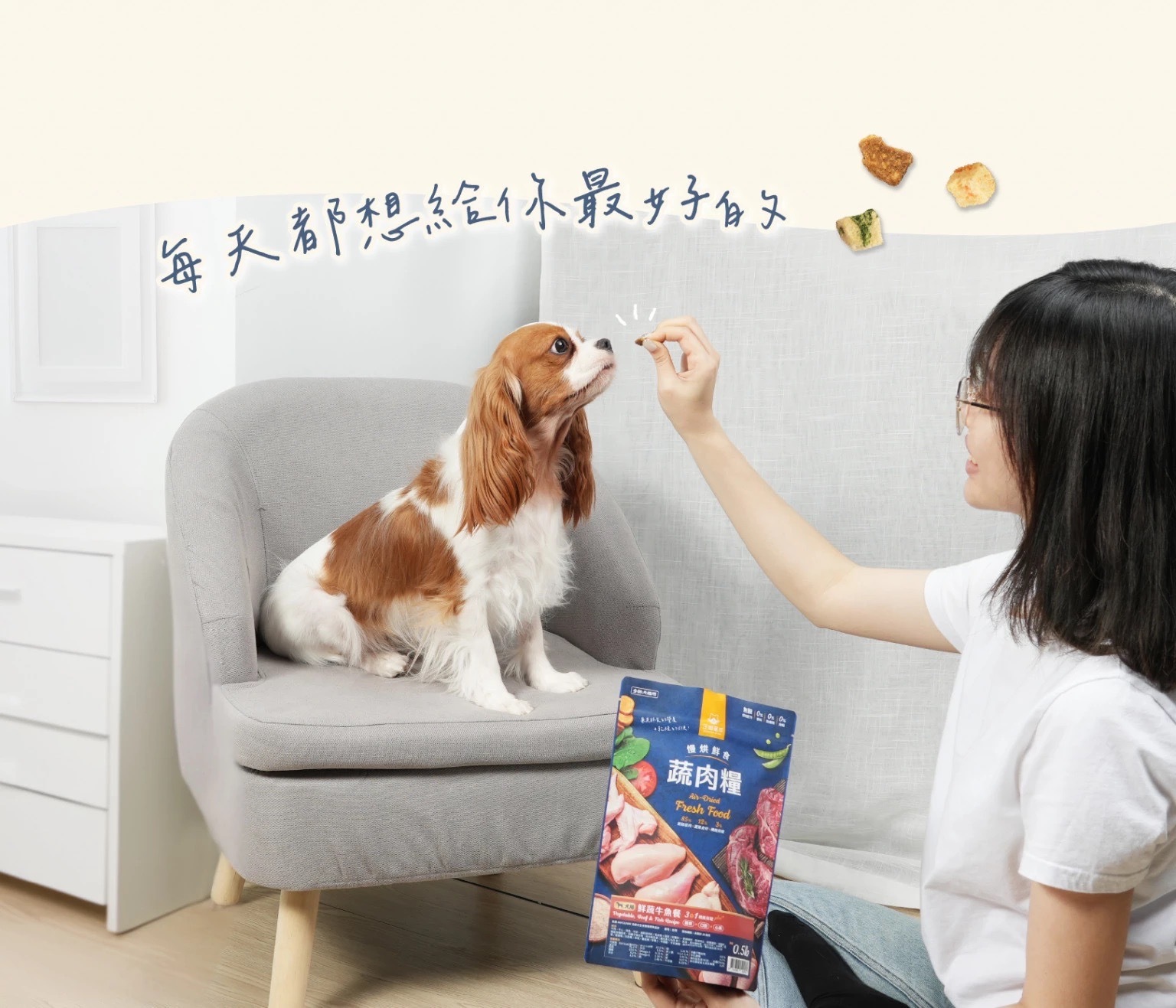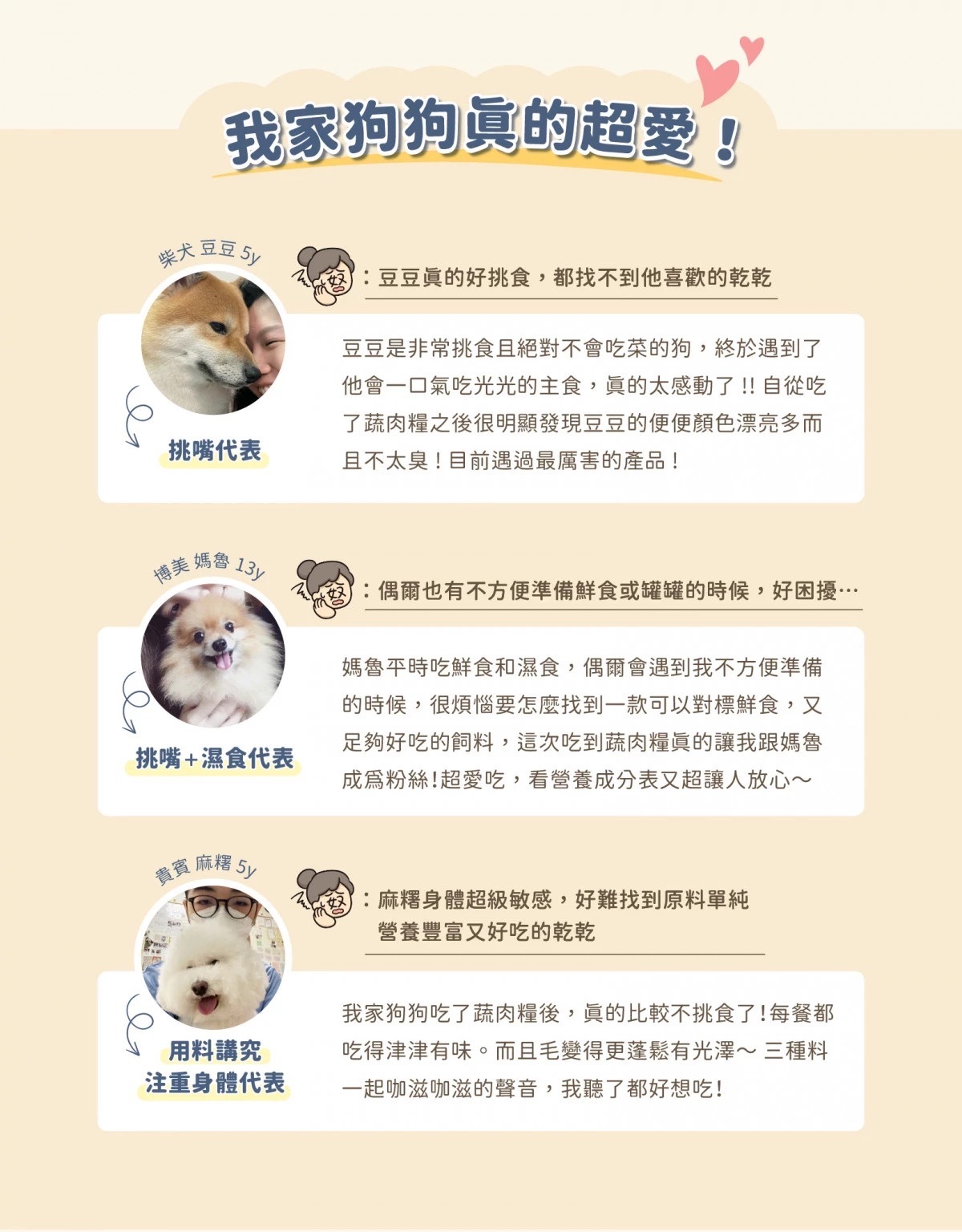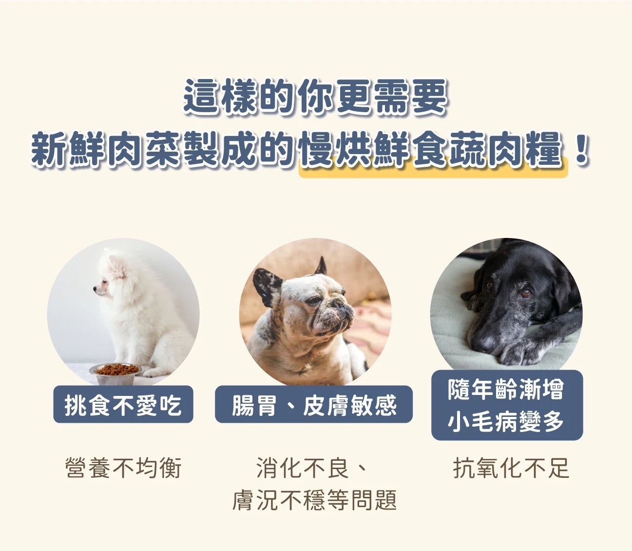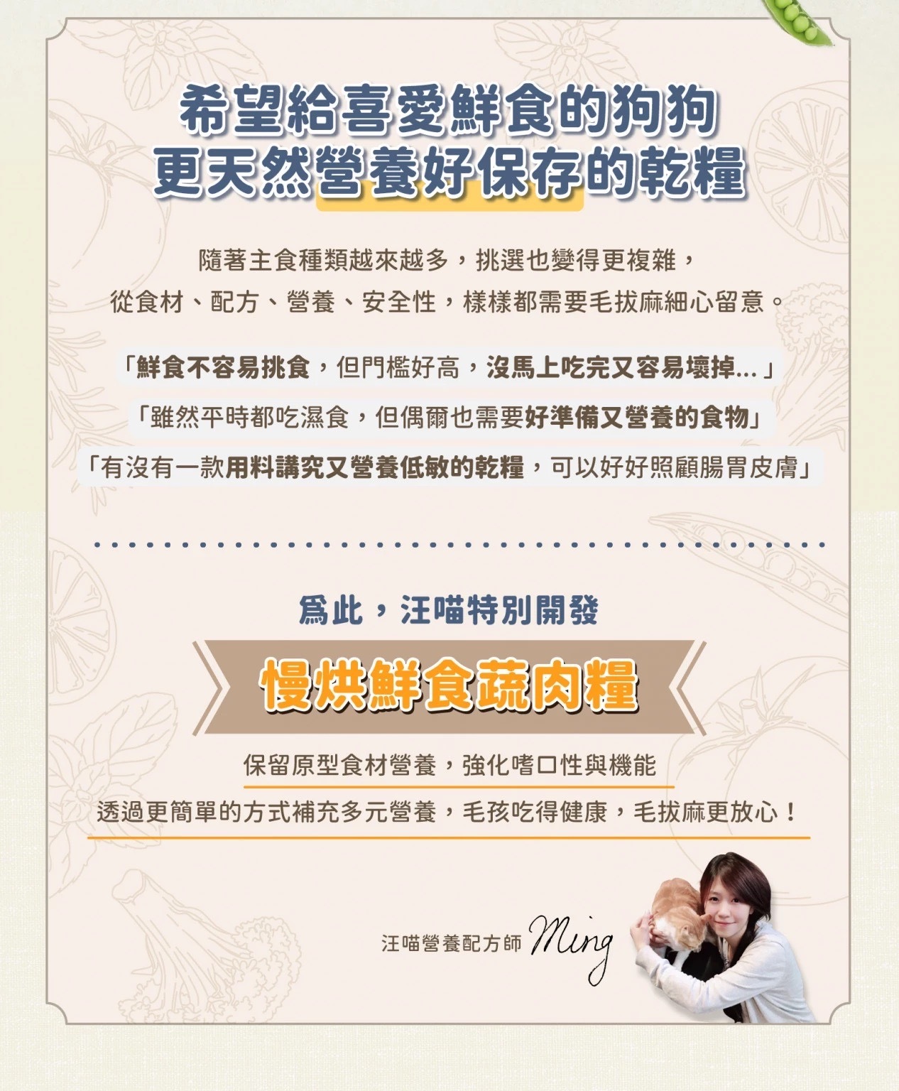 • 慢烘原肉糧+凍乾蔬肉粒,肉菜機能一次滿足!
