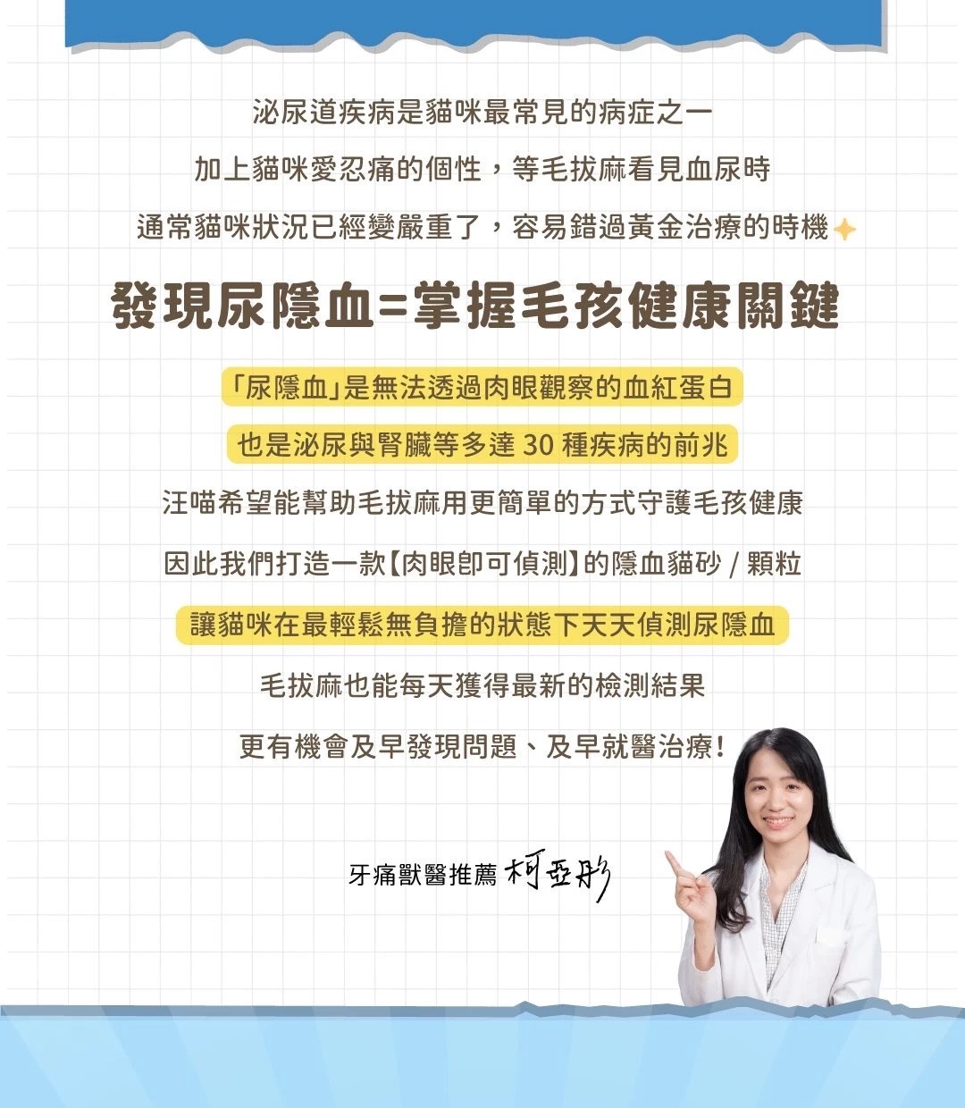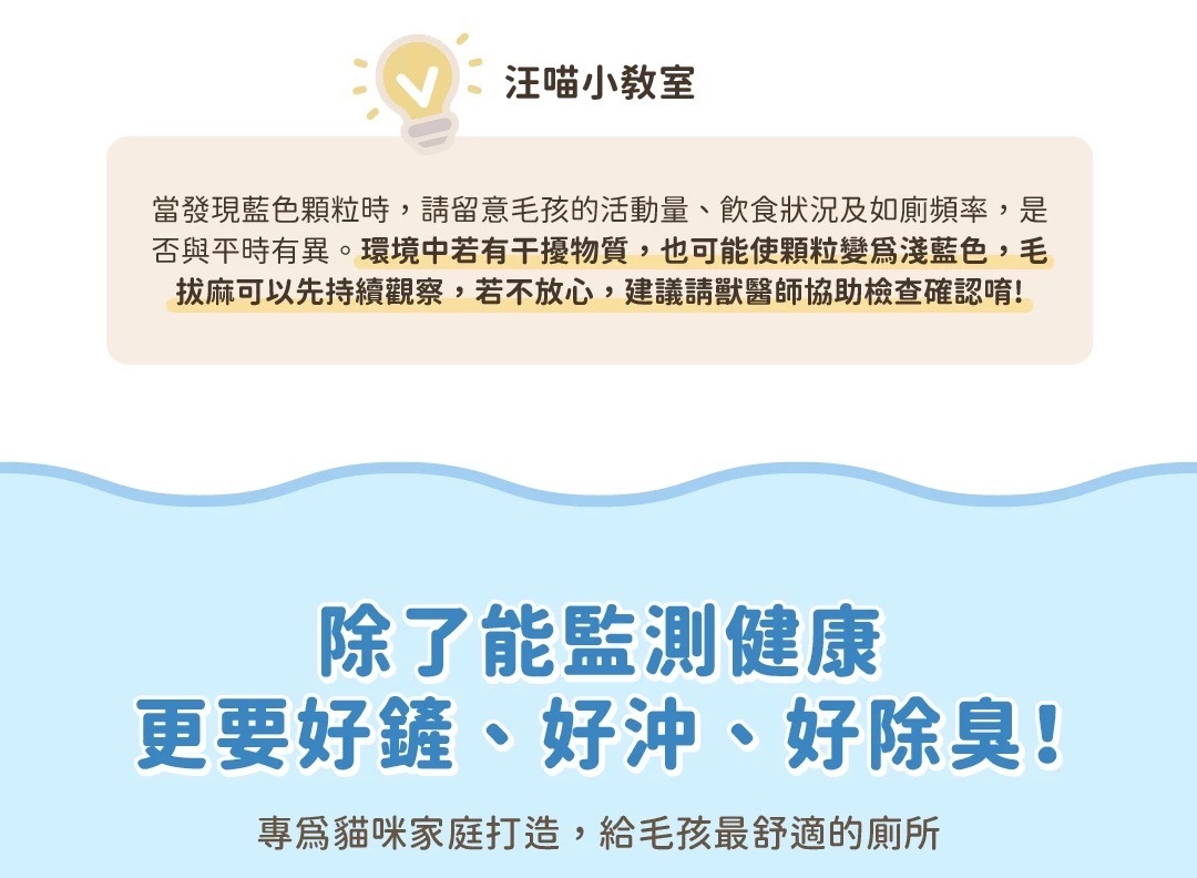 • 使用簡單,倒入砂盆即可監測泌尿健康