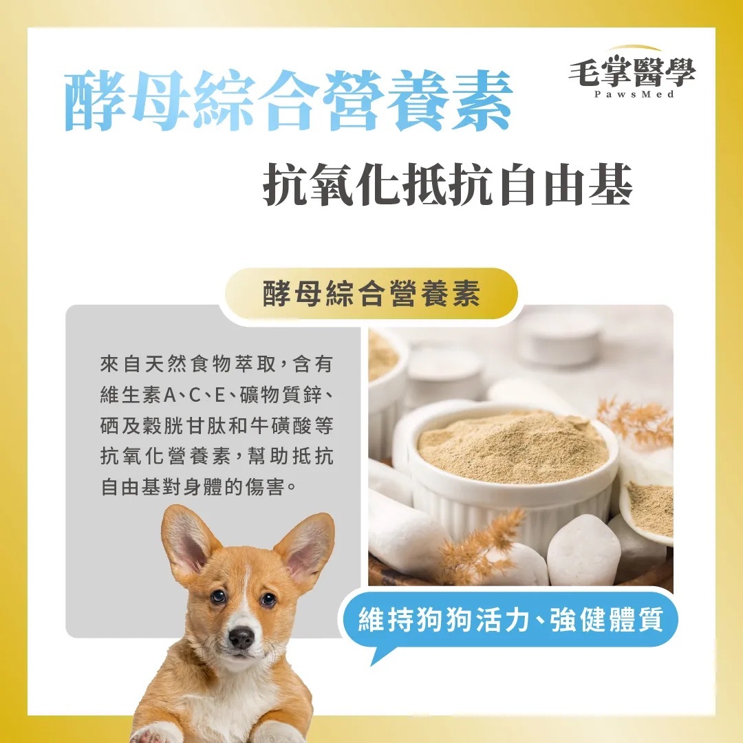 酵母綜合營養素,含有多種抗氧化成分、幫助身體抵禦外在刺激,並提供天然好吸收的綜合營養素維持狗狗整體的精神活力。