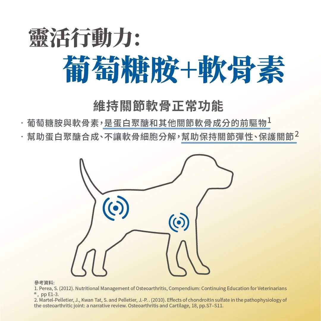靈活行動力: 葡萄糖胺+軟骨素,維持關節軟骨正常功能、保持關節彈性、保護關節。
