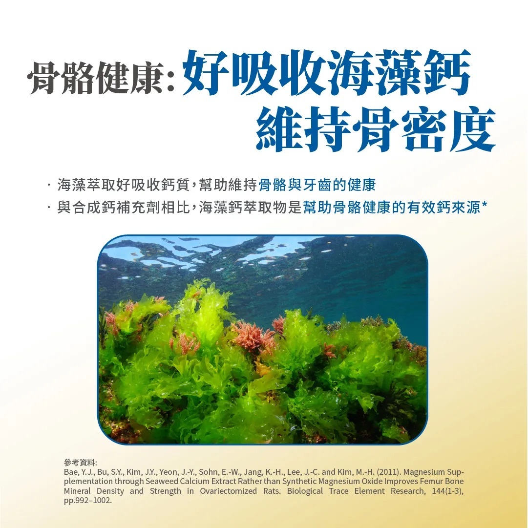 骨骼與肌肉健康: 海藻鈣+乳清蛋白,海藻萃取好吸收鈣質,鈣有助於維持骨骼與牙齒的健康。乳清蛋白為好吸收蛋白質來源,蛋白質可幫助肌肉生長。