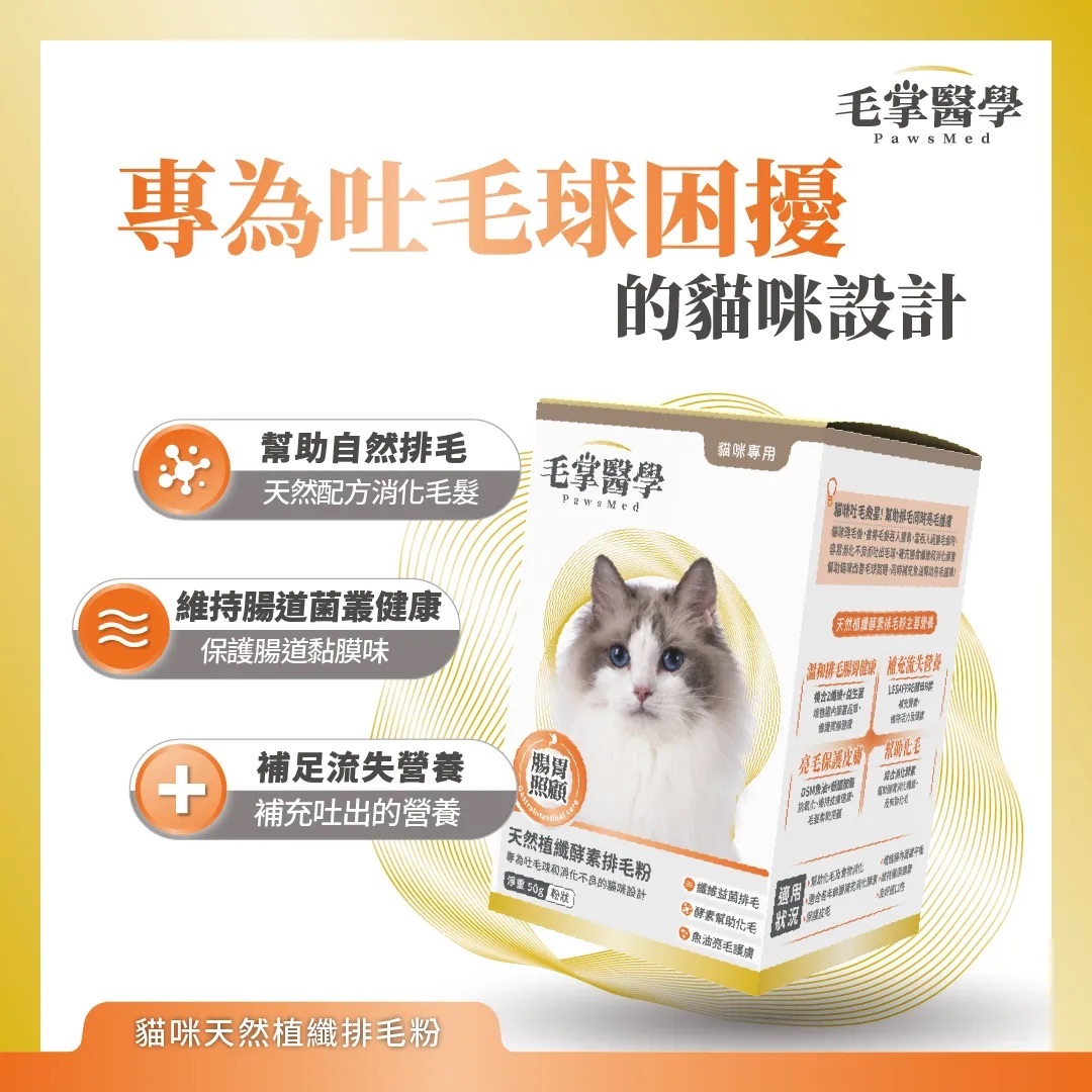 針對有吐毛球的貓咪,採用天然的排毛方式,同時補充貓咪嘔吐後流失的營養。
