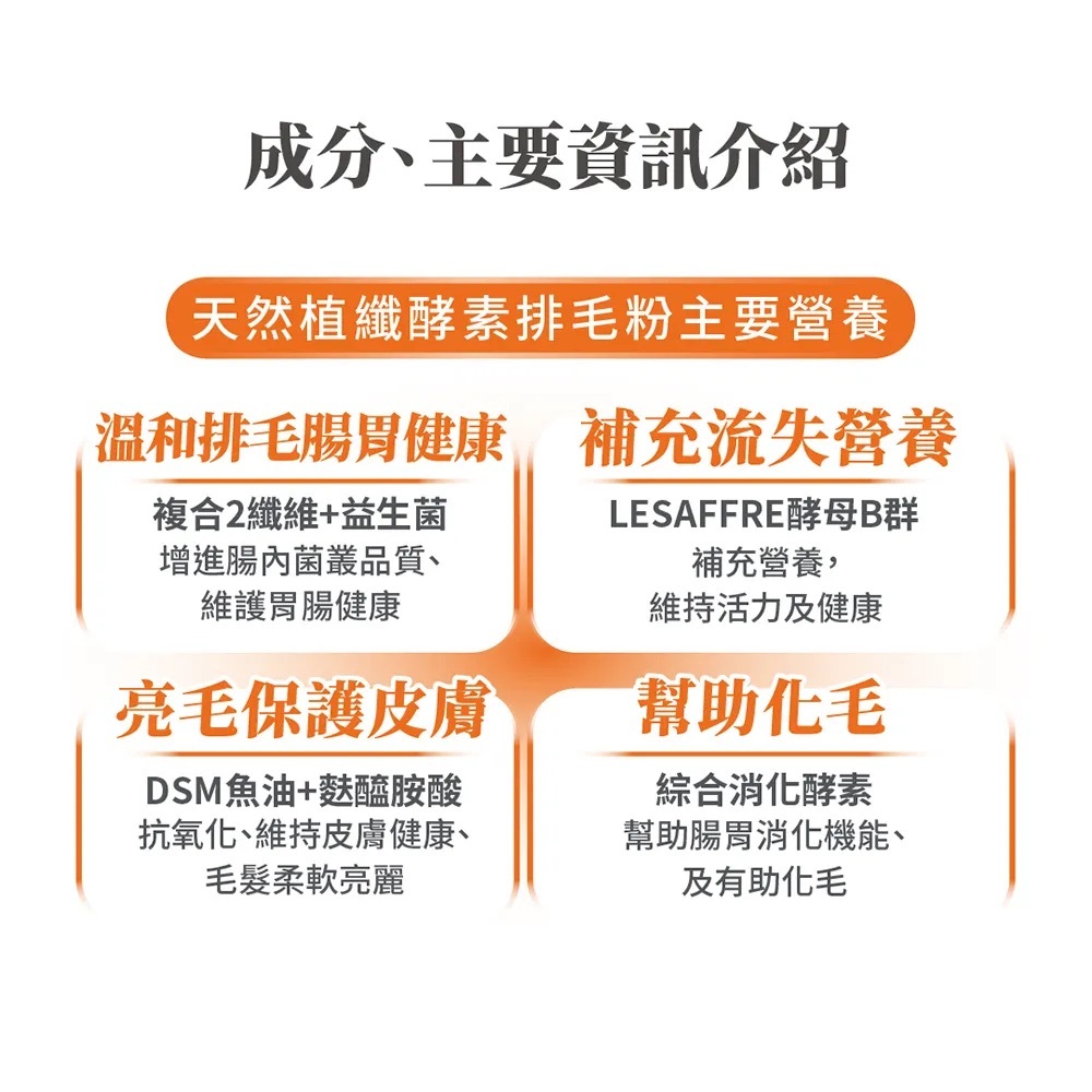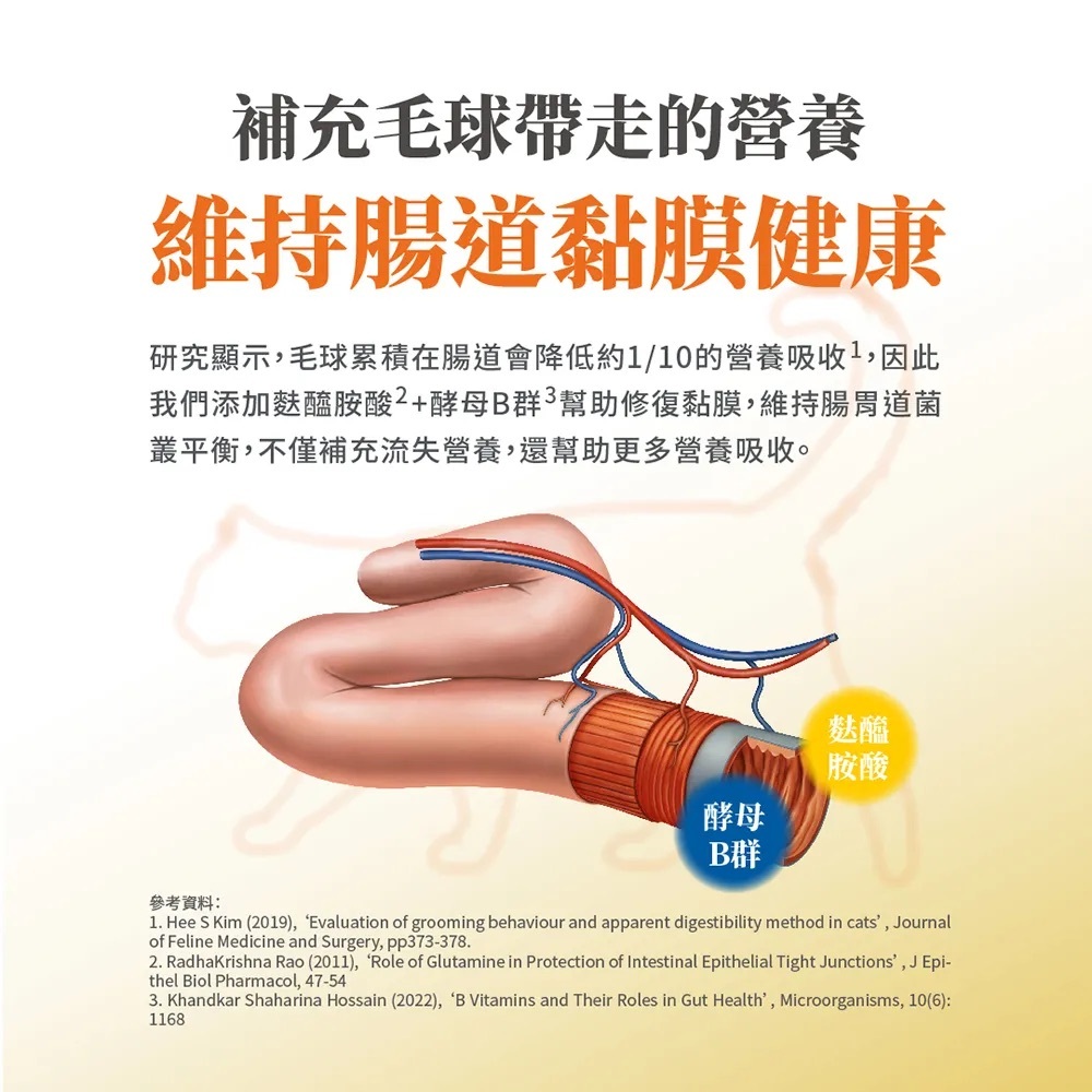 來自法國LeSaffre酵母維生素B群,補充因吐毛流失的水溶性維生素B群,維持好精神和正常食慾。麩醯胺酸,保護消化道黏膜健康。