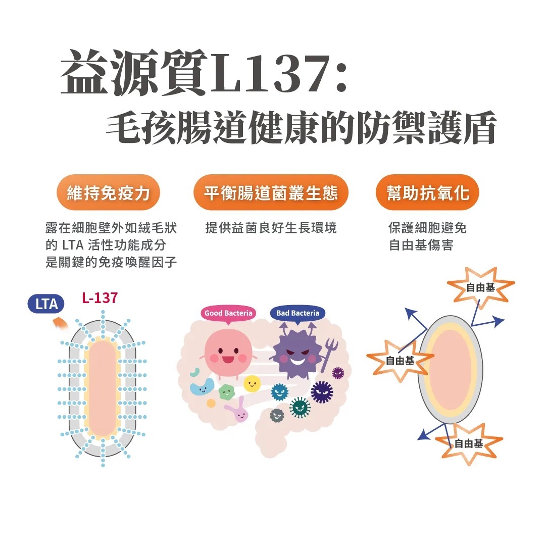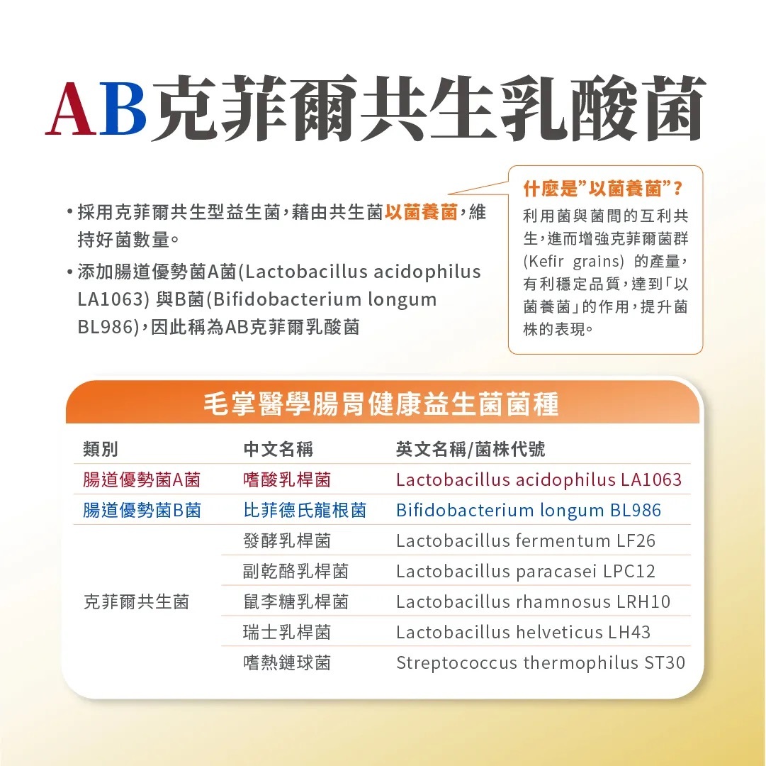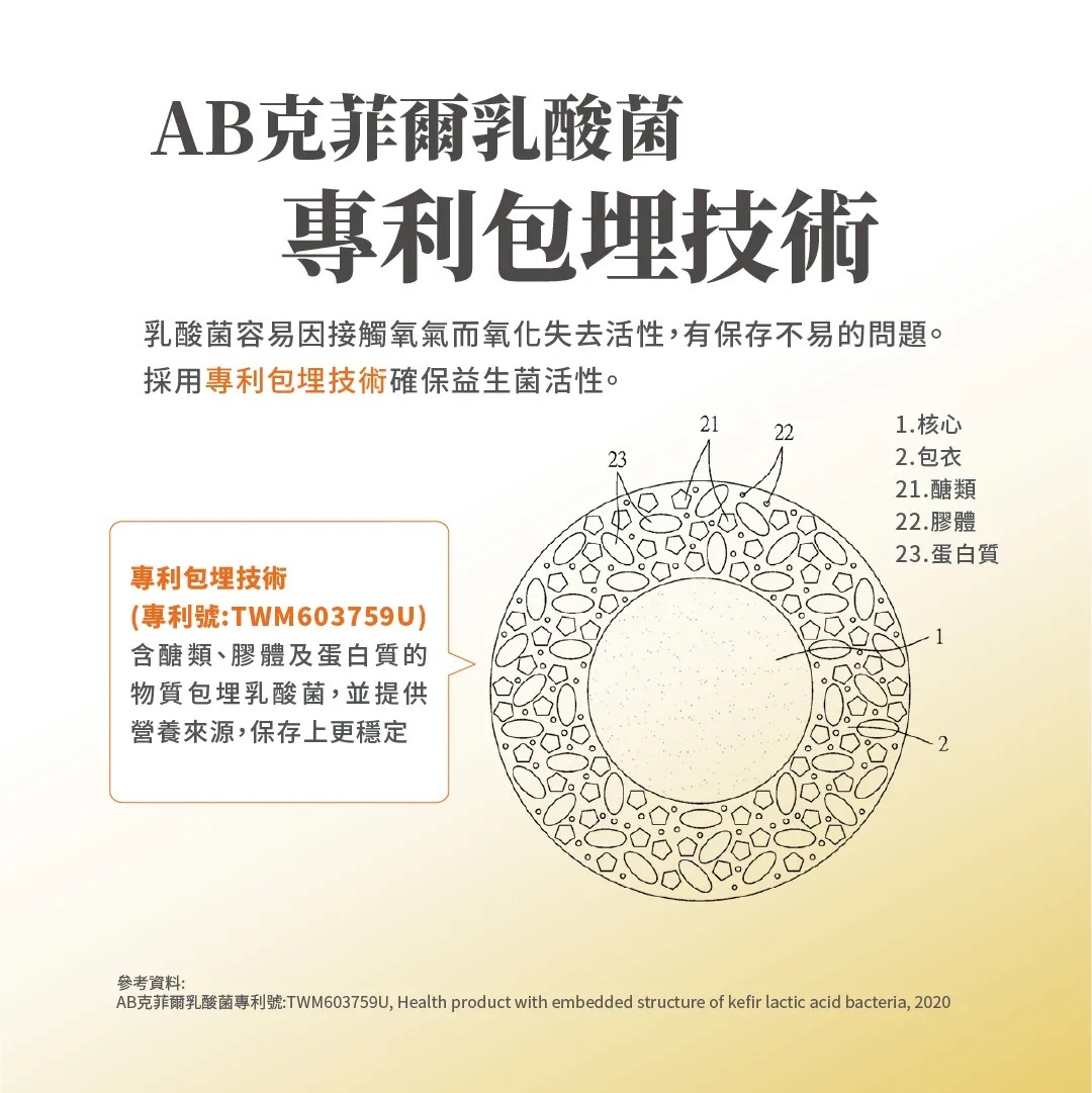 70億AB克菲爾益生菌+益源質L137,採用克菲爾共生型益生菌,藉由共生菌以菌養菌,維持好菌數量,包埋技術確保益生菌活性。益源質L137為次世代乳酸菌,維持腸道健康環境,增進腸道益菌品質。