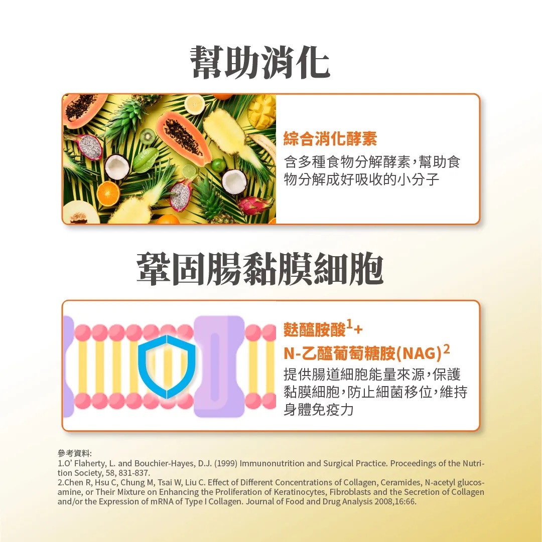 麩醯胺酸+N-乙醯葡萄糖胺(NAG),提供腸道細胞能量來源,保護黏膜細胞,防止細菌移位,維持身體免疫力
