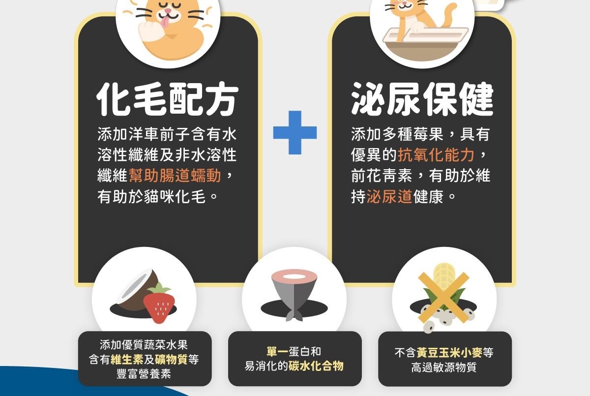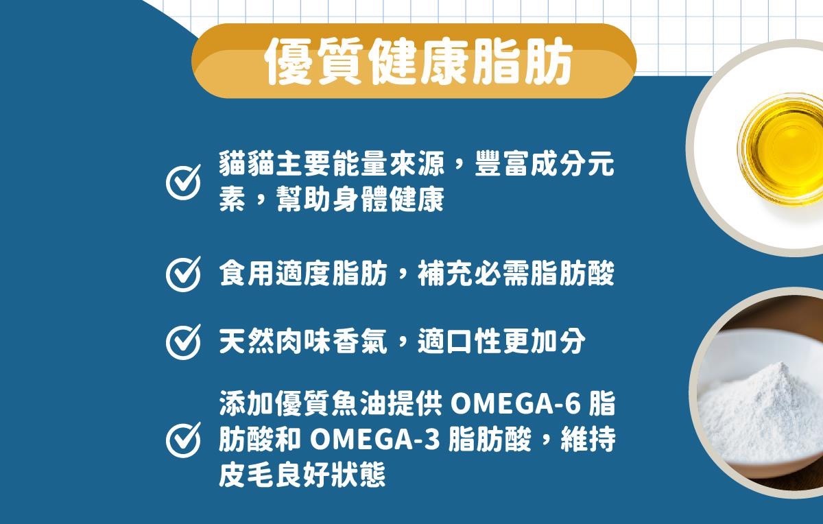 ✔ 特別添加頂級魚油提供omega-6脂肪酸和omega-3脂肪酸,維持皮毛良好狀態